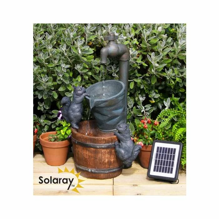 This adorable water feature, complete with two playful squirrels, is sure to become the main focal point of your garden. Water gently runs from the tap and pours down in to the stacked bucket and barrel below. This water feature is crafted from polyresin and is UV and frost resistant.